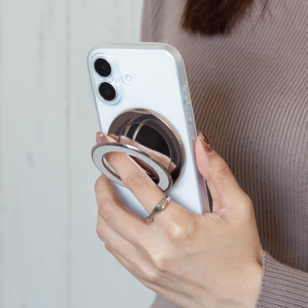 PUレザーとアンティークゴールドがお洒落なMagSafe対応スマホリング。
