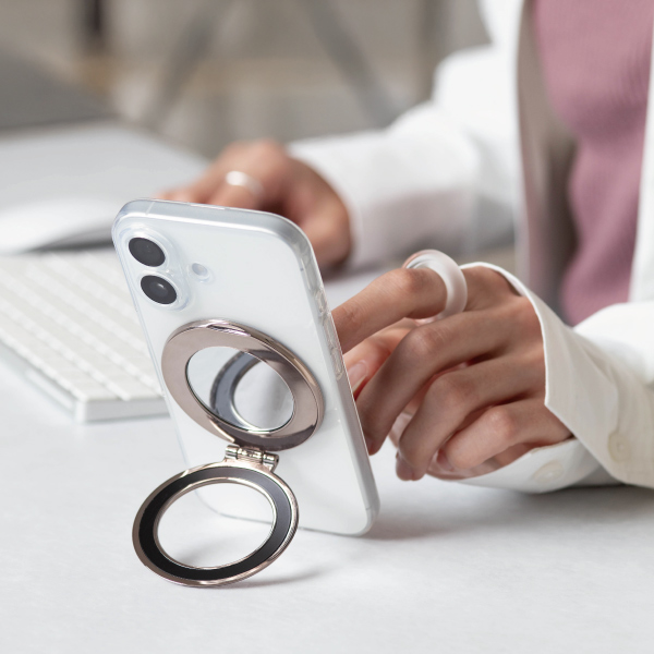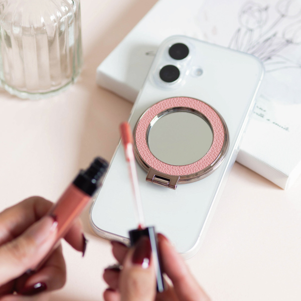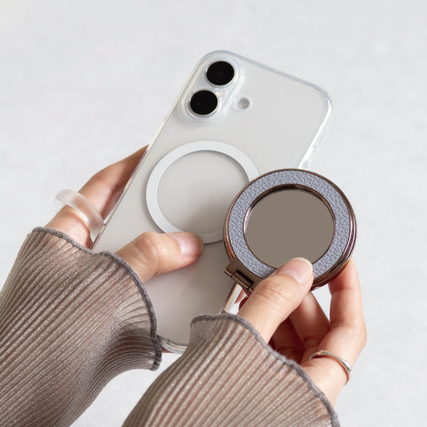 身だしなみチェックに便利な鏡付き。リングに指を通せば落下防止にも◎