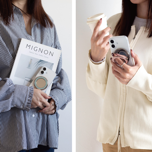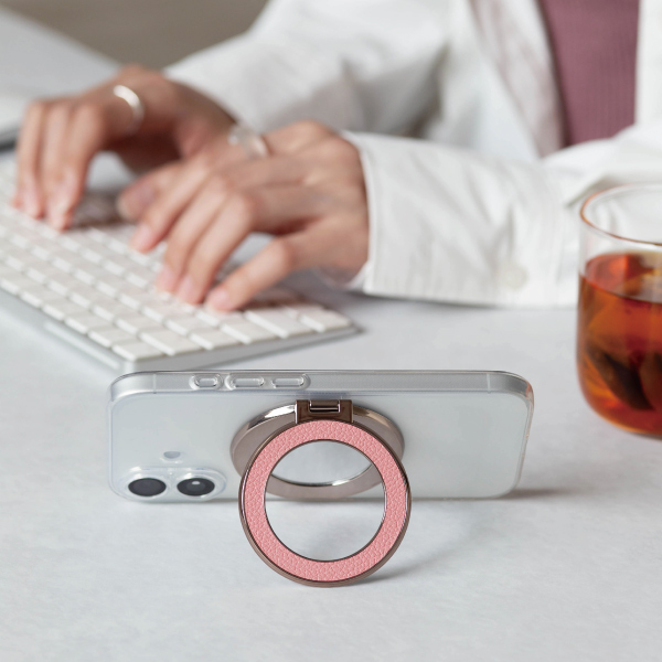 PUレザーとアンティークゴールドがお洒落なMagSafe対応スマホリング。